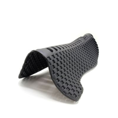 This pad is anatomically shaped, offers excellent shcock absorption properties, and provides a rear riser for saddles requireing stabilization and additional padding. The new thermoplastic material offers a low-profile but highly effective and extremely lightweight padding, without creating bulk under the saddle. The innovative structure of these pads has a multitude of little bulges with lateral holes permitting afree flowing, horizontally directed air circulation. The main benefit of this structure is that the bulges create a shock absorbing every time they are compressed and released by the movement of the horse. As a secondary benefit, this compression and release process generates a flow of refreshing air which keeps the back of the horse dry.