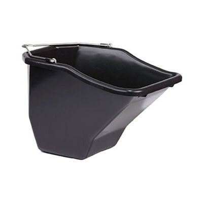 This patented, ergonomically designed feeding bucket is excellent for horses, cattle, and other livestock. Angular design better accommodates animal's facial structure, allowing a more natural eating posture and reducing animal behavioral problems associated with feeding. Tapered sides funnel feed toward the back of the bucket, making feed and grain more accessible without the animal having to strain in an awkward position. The Flat-Back provides stability against a wall or fence. Mounts on a flat wall with either a traditional wall bracket or snap hook (not included). Durable, impact resistant, high-density polyethylene construction with smooth, finished edges. The heavy-duty metal handle is notched for hanging. Measures 21.75in long x 15.5in wide x 13.5in high. Holds 20 quarts (5 gallons).