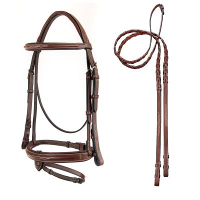 An Arc de Triomphe Signature Bridle, designed for sponsored rider Anne Kursinski, the Starman bridle is similar to the Imperial in looks, yet has padding on the crownpiece and sports a wider noseband. The noseband has a convertible flash (completely removable) and is 1.25" wide (including the padding). Cheeks are 5/8" and the browband is 7/8". Bridle features Herm. Sprenger buckles with stud ends at the bit. Comes complete with Raised Fancy reins. Available in Crank or Standard Cavesson options.