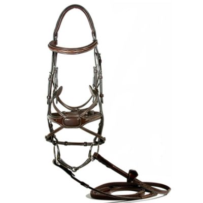 The elegant Arianna bridle is a mix of two nosebands. It prevents lateral movements of the horse's mouth and allows an independent function of the figure 8 with a gel center. Constructed from beautiful Italian Leather that is raised and fancy stitched with lovely ivory accent stitching throughout. The figure 8 noseband buckles to the crownpiece on both sides creating a more secure and adjustable fit. The bridle has an anatomic padded inlaid crown for the horses comfort as well as a streamlined look. Stainless Steel hardware. Matching raised and fancy stitched soft grip rubber reins included. You and your horse are sure to stand out in the bridle all the while improving your ride!