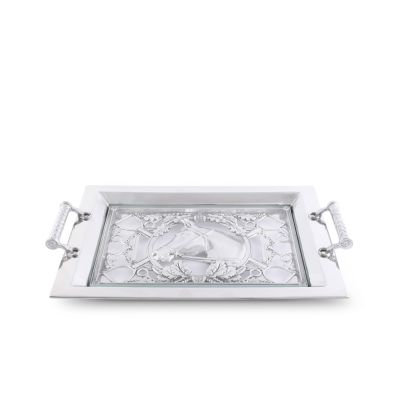 Elevate your serving game with the Arthur Court Horse Head Serving Tray, a stunning blend of equestrian elegance and functional design. Spanning 20 inches by 13 inches, this metal tray is adorned with a captivating horse head and tack design, encapsulating the spirit of the noble steed and the heritage of horse riding. The intricate detailing around the tray showcases Arthur Court's exceptional craftsmanship, with each horse head and piece of tack rendered in exquisite detail, bringing the beauty of the equestrian lifestyle into your home. The tray's generous size makes it perfect for a wide array of uses, from serving an array of appetizers to displaying decanters and glasses on your bar. A removable glass insert sits snugly within the metal frame, adding a layer of practicality and ease to your hosting. This feature not only highlights the artistic metalwork beneath but also ensures easy cleaning and maintenance, making it ideal for both intimate gatherings and grand celebrations. Crafted with durability in mind, this serving tray is a testament to the quality and style synonymous with Arthur Court designs. Whether you're an equestrian enthusiast or simply someone who appreciates the finer things in life, this serving tray is a must-have addition to your serveware collection, promising to serve and impress for years to come.