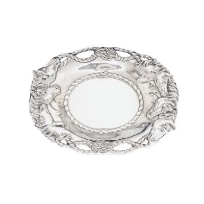 Admire the tremendous detail in Arthur Court's Horse Oval Tray every time you use it. Stallions mirror each other in elegant symmetry on opposite sides of this dish. The leading horse in each group bites onto a thick rope as it twists and forms the piece's openwork border. A ropy pattern also circles the smooth interior, which stands out against the beautifully detailed designs in this handmade, aluminum tray.
