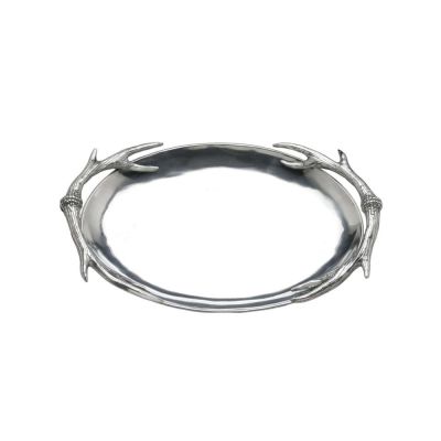 Realistically fashioned burrs infuse two antlers together on both sides of this piece, extending forks in opposite directions along the edge. The rustic appeal of the design accents the gleaming interior of this handmade, aluminum platter.
