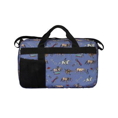 The AWST Int'l "Lila" Hunter Ponies Duffle Bag is an ideal choice for a helmet bag, barn essentials, or a convenient overnighter. Crafted from durable 600D Polyester, this versatile duffle features a spacious main compartment with a sturdy dual zipper for easy access. It also includes an internal divider pocket and a front mesh pocket, allowing for effortless organization. With its adjustable shoulder strap and convenient grab handles, this fashionable duffle bag is well-equipped for travel. Measures 15"L X 9"H X 9"W