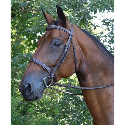 The Black Oak Spruce Hunter Bridle combines exceptional value, with the quality craftsmanship & details KL Select products are known for. The Spruce offers a classic look with a 1-1/8" square raised, fancy stitched noseband, a matching 3/4" browband, and 1/2" cheek pieces. The Spruce design is low profile and is not padded. Comes complete with 5/8" fancy stitched square raised Laced Reins. This bridle is made in a top quality drum-dyed Spanish leather. All hardware is stainless steel, with hook stud ends, and a roller buckle on the noseband.