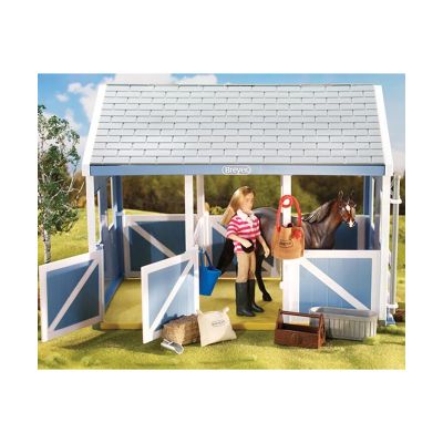 Every horse looks forward to feeding time! Set includes water trough, feedbag, bag of feed, bucket, scoop, hay bale, grooming tote and curry comb.