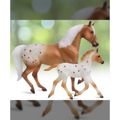 This fun set includes a palomino blanket Appaloosa and her chestnut leopard Appaloosa foal.