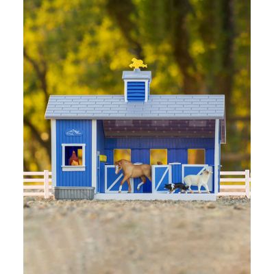 Breyer Farmsâ„¢ has an exciting new playset - Home at the Barn! This beautiful blue, 3-stall barn comes complete with fencing, a dog, a sheep, a hen with chicks, a Stablemates horse, and water trough. We're sure the youngest Breyer fans will have hours of fun playing and pretending that they're on the farm!