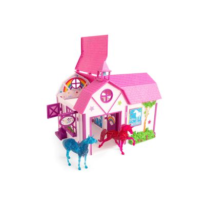 Calling all unicorn lovers! We have an exciting new playset just for you! This glittering barn has a hinged roof and working doors for easy access to hours of creative play. It is decorated with tons of fun, colorful accents, and comes with two translucent sparkly unicorns.