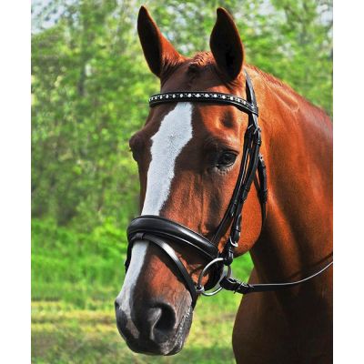 The Cadence Dressage Bridle exudes elegance, with it’s subtly shaped noseband and classic Black & Clear crystal browband. The Cadence features a modernized threaded headstall, padded contoured and lined for easier adjustment over the poll; with 5/8" cheek pieces. The soft padded flash crank noseband measures 1 1/2" at its widest and gently tapers down to 1 3/8" on each side. Comes complete with ¾" Dressage Reins (plain leather reins with stops). This bridle is made of the best Grade A Sedgwick’s English leather. All hardware is stainless steel, buckle end, with a roller buckle on the noseband.