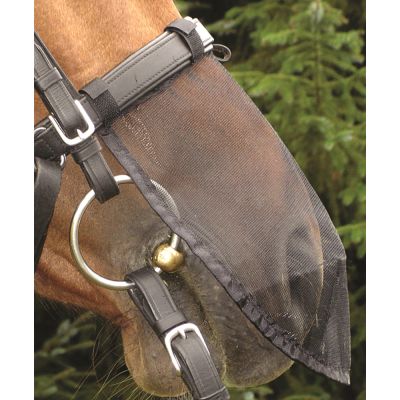 Easily attaches to any cavesson or tiedown noseband with a secure hook-and-loop closure. Covers the horse’s nostrils and protects from dust and insects. Relieves shaking head syndrome. Permitted by British dressage and British eventing associations.