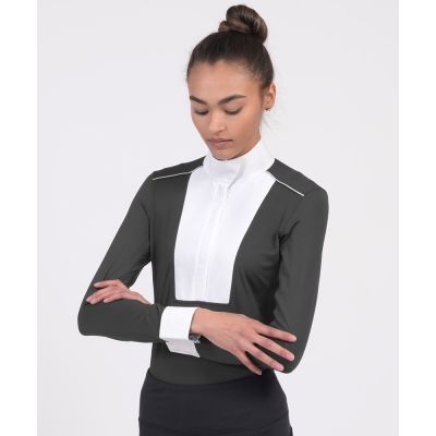 Blending classic style with superior performance features, our pull-over style long sleeve show shirt has perfectly placed mesh panels for immediate cooling, an inventive bib design that prevents gaping, and hidden snap collar and cuffs featuring Liberty® of London patterns that show off your street to stable side when worn casually.