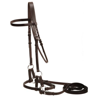 Sidepull made from English bridle leather, featuring a doubled and stitched nose and 5/8" English buckle end reins. An excellent tool for training, sidepulls are versatile and can be utilized on horses of any age to reinforce control methods. Additionally, they serve as a viable alternative to using a bit in situations involving injury or teeth problems.