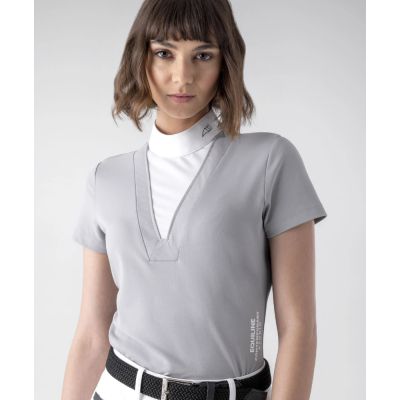 This modern twist on a short sleeve competition shirt made of tech piquet stretch fabric, a white poplin collar, and a tech mesh insert. Versatile enough to be worn in the ring under a jacket with the V-neck white detailing hiding the sleet grey coloring. The collar has a side zip for a seamless look in the front, it also features two printed logos one on the collar and one on the left hip.