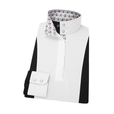 Essex Ladies Luna Long Sleeve Panel Show Shirt Details: full length white panel front crisp white cotton collar and cuffs cool, stretch performance fabric under sleeve mesh ventilation panels natural comfort stretch tapered body fit with back darts pullover snap front contrasting fabric trim detail