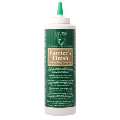 Farrier’s Finish is a liquid topical hoof dressing that combats the “hoof eating” bacterial and fungal invasions which cause white line disease, thrush, and poor hoof quality. It is also a conditioner that supports correct hoof capsule moisture balance in excessively wet or dry conditions.