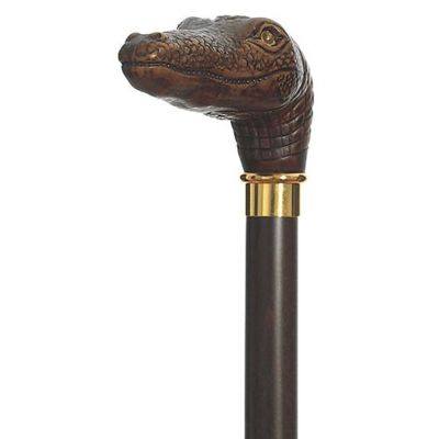 This Fritz shaped brown wood tone gator shaped handle with brass ring and collar is made in Italy. The handle is molded in cellulose acetate, an extremely durable material for lasting use. It is mounted on a 3/4" diameter beechwood shaft enriched with seven coats of brown lacquer. The shaft measures 36" in length.
