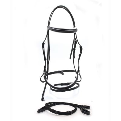 The Henri de Rivel Pro Padded Dressage Bridle with Flash and Web Reins is simple, traditional and functional for all levels of riding. The padded nose and brow bands ensure equine comfort in two classic color choices. The flash strap is conveniently removable for when not in use. White structural stitching makes gives a traditional pop of detail. Cheek pieces measure 1/2" with 5/8" webbed reins included.