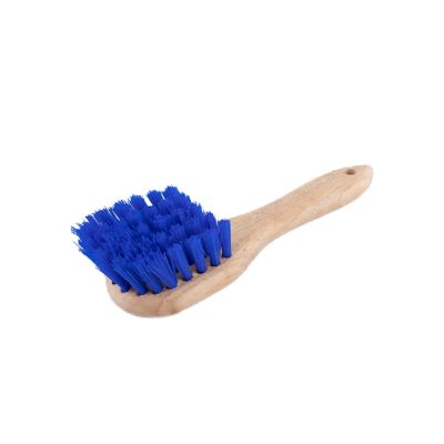 9 1/2" wood block, stiff polypropylene. Whether it's cleaning hooves or buckets, use this brush. The wood handle is very comfortable to hold, and the tough, angled polypropylene tufts are perfect for scrubbing off dry or wet mud, or getting into corners.