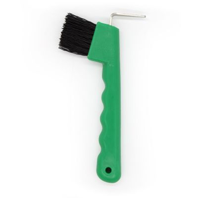 Tempered steel Hoof Pick with super stiff nylon bristle brush and hard plastic handle with grooves for easier gripping and comfort. 6" long.