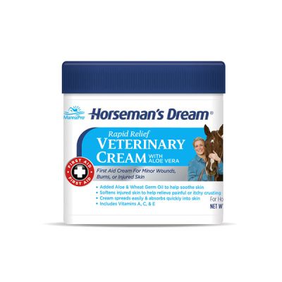 Horseman's Dream veterinary cream is an excellent and effective first aid cream for a variety of skin conditions including minor wounds, scrapes, burns, and sunburns. The soothing, aloe-based cream readily absorbs into skin helping to provide rapid relief for your horse.