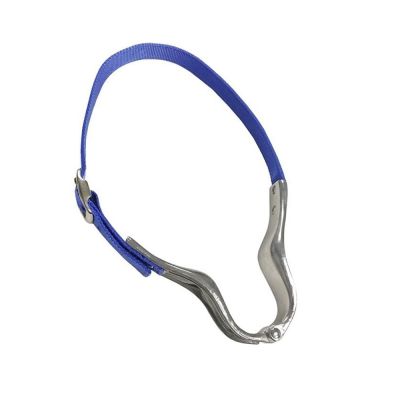 Nutcracker Cribbing Strap made with a strong, aluminum throat piece hinged to apply the proper pressure on the throat when horse cribs. Adjustable nylon neck strap.