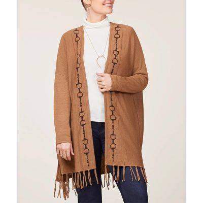 Meet the perfect equestrian cardigan that canters through any social setting with ease. Conversation flows as easily as the fringed hem when guests glimpse the bitted equestrian trim, a pretty peek into your deepest passion. Elegant and easy to style, this poncho delivers luxury layering.