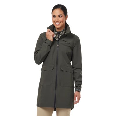 This rain jacket is waterproof and fully seam-sealed for complete protection from rain and wind. Lightweight, durable fabric stretches for comfort, while pit zips add ventilation. Unzip the split-back, equestrian shaped hem for in-saddle performance and you’re good to gallop through anything. Stylish longer length covers more, while the gathered back elastic creates a flattering waist. Extended brim hood secures with drawcord. Dual entry pockets ensure rain won’t melt sugar cubes.