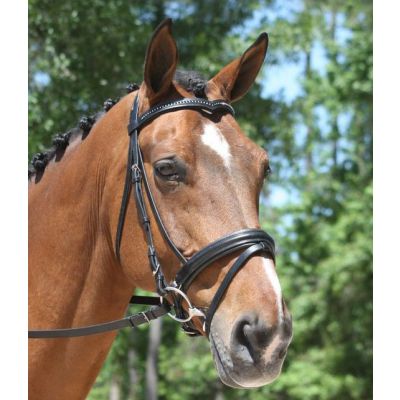 The KL Italia Pirouette has a classic look, yet with a bolder noseband made wider with extra padding. This bridle features a 3/4" "V" shaped crystal browband. The Pirouette also features a 1-5/8" padded round raised flash crank noseband, 5/8" cheek pieces, and a padded threaded headstall – providing the ultimate comfort for your horses"s poll. Comes complete with 3/4" Dressage Reins (plain leather reins with stops). This bridle is made of the best Italian leather. All hardware is stainless steel, buckle end, with a roller buckle on the noseband.