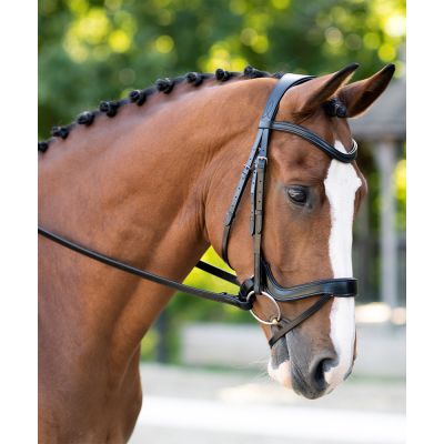 The NEW Black Oak Palm Ergonomic Bridle is KLSelect's latest addition to the range. The Palm Bridle features similar design details of their more expensive ergonomic bridle, intended to alleviate pressure on your horse’s most sensitive areas – poll, mouth, and ears. The Palm’s key features include an ergonomically-designed noseband (1 1/2" across the front between the flash strap, narrowing to 1 1/4" on the sides), it’s shape adapted to fit the horse’s anatomy and to relieve pressure on the main facial nerve; and a softly padded, extra wide crownpiece shaped to evenly distribute poll pressure and to allow room for the horse’s ears. The Black Oak Palm is complete with a curved, flat padded leather browband and 1/2” cheek pieces. Comes complete with 3/4" Dressage Reins. All hardware is stainless steel, hook-stud end, with a roller buckle on the adjustable noseband. This bridle is made of the finest drum-dyed leather.