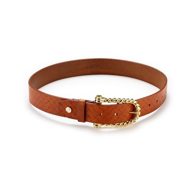Tie your look together with a (literal) twist! The Hannah Childs signature horse bit inspired belt buckle comes in varying finishes to complement each belt color and style. Made from recycled leather, the belt is finished off with a subtle woven embossed pattern to add texture.