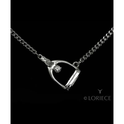 This angled stirrup iron necklace is both stylish and comfortable to wear. Set in a four claw setting at the top of the stirrup is a 1/4 ct cubic zircon.