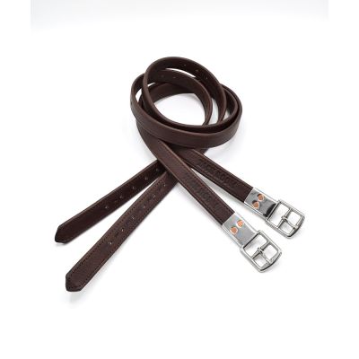 Soft, leather-covered nylon webbing with stainless steel buckle and plate. The inner nylon eliminates stretching that commonly occurs with stirrup leathers. The outer soft leather covering provides a nice surface that works well with covered saddle flaps. The flat buckle reduces bulk under the leg.