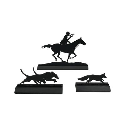 Adorn your table, mantle or shelf with our unique set of 3 standing equestrian fox-hunting silhouettes. Laser cut and painted flat black, they are double-sided for reversible direction. Makes a unique gift and a great addition to your equestrian or hunting lodge decor!