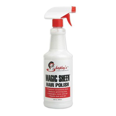 Cut down on grooming time and leave your horse's coat with a healthy shine with Shapley's Magic Sheen. Magic Sheen is a specially formulated hair polish that repels dirt and stains, loosens tangles, and helps prevent hair loss. This spray gives your horse a healthy looking coat, mane and tail for both the show ring and everyday use. Unlike other silicone-based products, Magic Sheen will not over-dry hair.