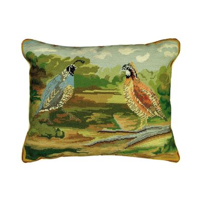 Handmade 16" x 20" needlepoint pillow made from 100% wool. Two beautiful Quails, an Eastern and a Western Quail facing each other. Very realistic detail. True colors for each bird. Lovely earth tone field surrounds the birds. Excellent pillow for Quail lovers.