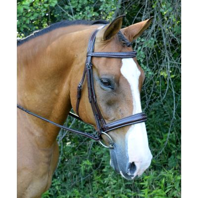 Understated design with maximum affect. The Ocala bridle features a subtly shaped noseband and browband, as well as our ergonomic uni-crown headstall. The soft padded, round raised fancy stitched noseband measures 1 1/2" at its widest and gently tapers down to 1 3/8" on each side and the browband measures 1" in the center and narrows to 1/2" on the ends. Comes complete with 5/8" fancy stitched round raised Laced Reins. This bridle is made of the finest Grade A Sedgwick’s leather. All hardware is stainless steel, with hook stud ends, and a roller buckle on the noseband.
