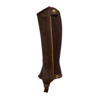 Soft Amara half chaps with ribbed stretch panels, snap closures at top and bottom, and hidden genuine YYK dirt-resistant zippers. Available in multiple colors.