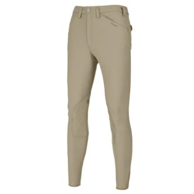 Comfortable breeches with knee patches from McCrown, two slanting pockets at the front, two seat pockets with flaps at the rear, wide belt loops, and velcro closures at ankles.