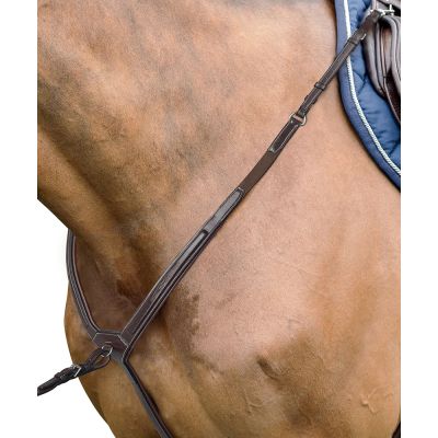 An anatomic and elegant two-point breastplate featuring raised profiling and fancy stitching. The anatomical shape was designed for better pressure distribution. The breastplate also features soft padding along the entire surface. The fastenings include elastics.