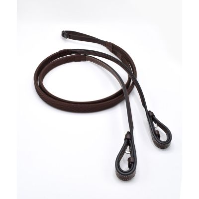 These 5/8" Rubber Reins are square raised with fine white stitching on the leather ends. Features stainless steel hook studs and tapered ends.