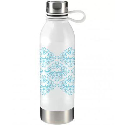 This upscale reusable water bottle features a secure screw-on lid with a soft handling loop. It stands at **9.6 inches (H) x 2.7 inches (W)**. The stainless steel construction ensures durability, while the double-walled and vacuum-sealed design keeps your beverages hot or cold for hours. The contoured shape makes it easy to hold, and the removable mesh filter prevents ice from blocking the drinking spout.