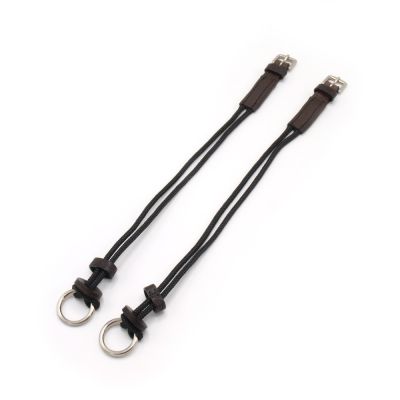 Made of high quality Stubben leather in combination with black nylon ropes. The rings and buckles are made of stainless steel. The rings are not stitched on to the nylon ropes but fixed with a rope loop only. Just slide the rope down through the gag bit, then loop the rope over the ring. No more screws or stitching!