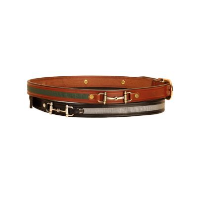 Made with fine english bridle leather, this 1" belt features creased edges, two Barrel Dee bit details, a ribbon accent between the bits, and a sewn in buckle.