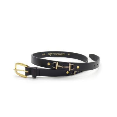 Made with the finest bridle leather, this 1" belt features creased edges, two snaffle bits details, and a brass sewn buckle. These belts are perfect for riders' breeches, but can easily complement any outift, whether it be a skirt, slacks, or jeans.
