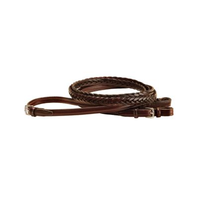 Bridle leather rein with five plait braided hand hold area. Features stainless steel center buckle and buckle bit ends.