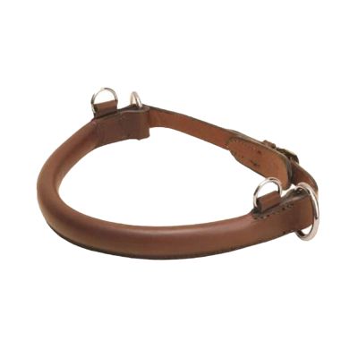 This is a bitless hackamore from Tory that uses leather for the jumping style. It applies pressure on different areas of the face, nose and chin to control the horse.