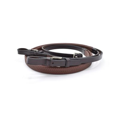 Plain, creased competition rubber grip rein. Features buckle bit ends and rubber pieces over the hand hold area.