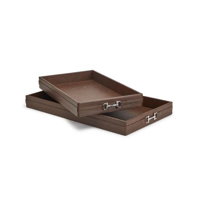 Great for entertaining, this set of 2 serving trays serves both purpose and presentation. With a rich chocolate brown vegan leather and silver tone horse bit accent these trays make a great decorative accent on your coffee table.