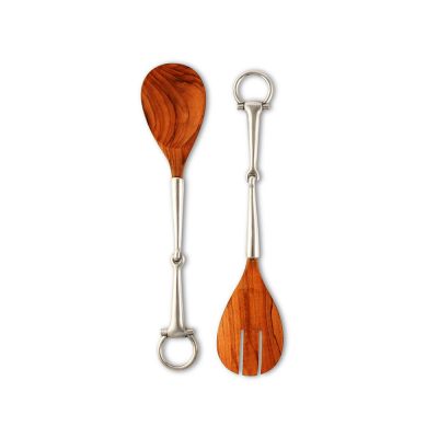 Introduce extra elegance to dinner service with this bit wood salad server set. The high-contrast look of the acacia wood surfaces and silver-tone pewter handles pairs seamlessly with bowls, platters and dinnerware in hunting lodges and country cabins.